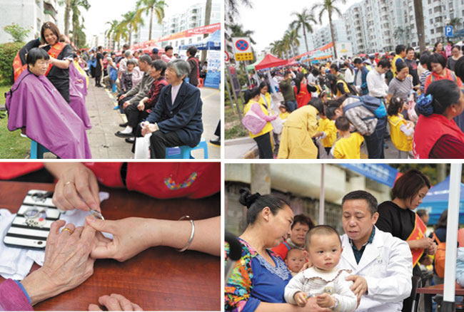 本屆“學(xué)雷鋒”一條街設(shè)置了政策宣傳類(法律宣傳、辦證咨詢等)、生命健康類(國民體質(zhì)測試、義診、小兒推拿等)、居家生活類(理發(fā)、清洗眼鏡、壓面條、修單車、修電腦、磨刀、縫紉、升級機頂盒等)、居家安全類(安全警示錄播放、上門排查安全隱患、安全知識有獎問答、銀行防詐騙等)、環(huán)境保護類(過期藥品回收、舊書舊衣物回收、清潔家園等)、公益跳蚤超市義賣六大類服務(wù),共有25家單位(組織)為社區(qū)居民提供了50多項免費服務(wù)項目。國民體質(zhì)測試、理發(fā)、小兒推拿、修單車最受居民的歡迎。