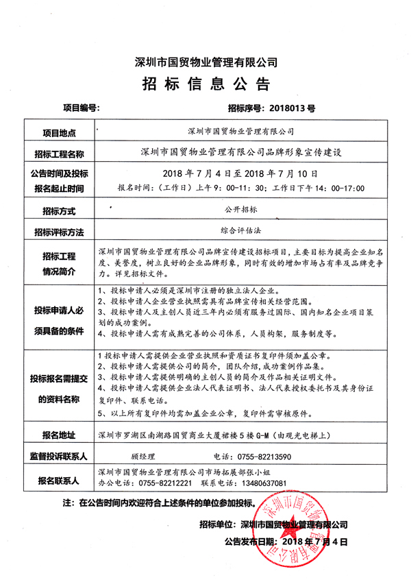 上一篇:深國貿(mào)物業(yè)公司員工工作服(夏裝)招標公告