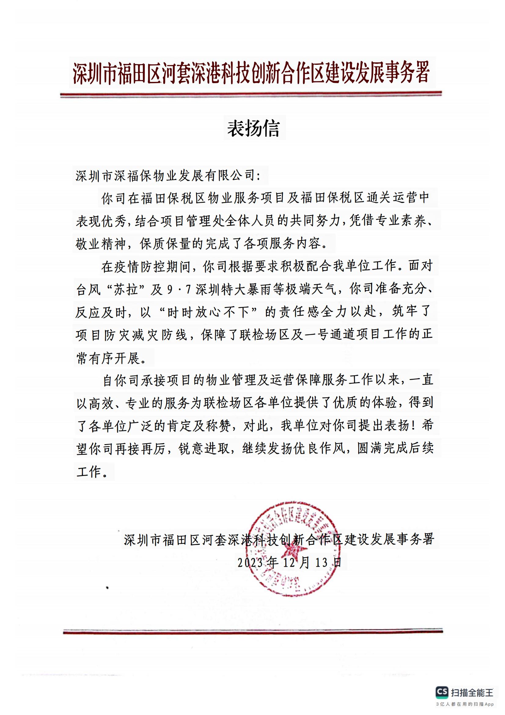 近日,國貿(mào)物業(yè)成員單位福保物業(yè)公司(以下簡稱:國貿(mào)福保物業(yè))收到河套深港科技創(chuàng)新合作區(qū)建設(shè)發(fā)展事務(wù)署表揚(yáng)信,對國貿(mào)福保物業(yè)在日常管理服務(wù)、運營保障、極端天氣應(yīng)對等工作中展現(xiàn)出的專業(yè)素養(yǎng)、敬業(yè)精神給予高度肯定。