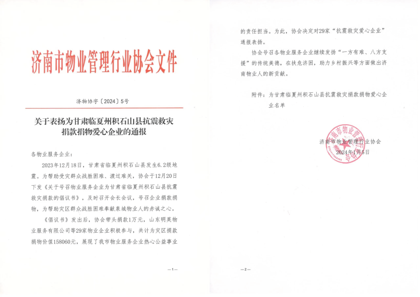1月5日,濟南市物業(yè)管理行業(yè)協(xié)會發(fā)布了《關(guān)于表揚為甘肅臨夏州積石山縣抗震救災(zāi)捐款捐物愛心企業(yè)的通報》,對國貿(mào)物業(yè)山東公司等29家愛心企業(yè)為甘肅積石山縣抗震救災(zāi)作出積極貢獻的行為提出了表揚。